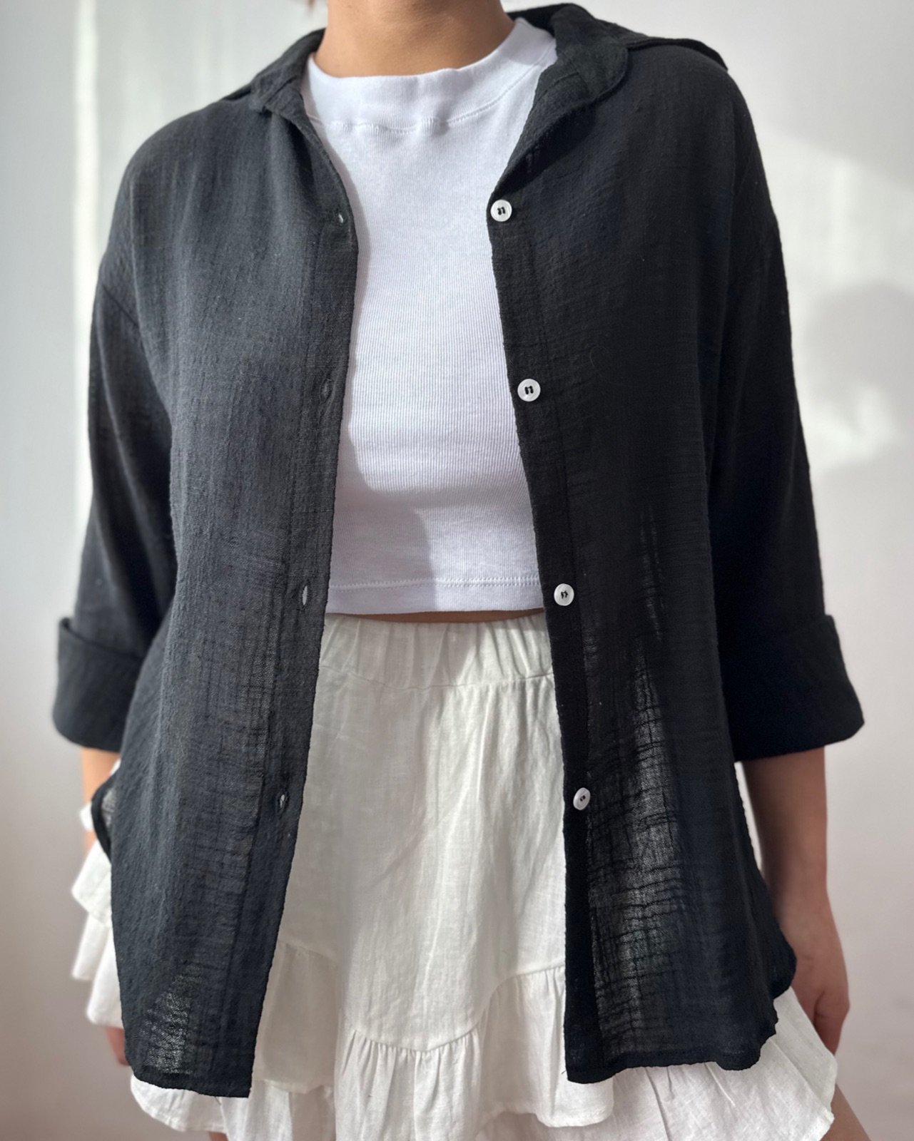 Su diseño amplio con cuello clásico y botones en contraste la convierte en una prenda versátil, fresca y cómoda.