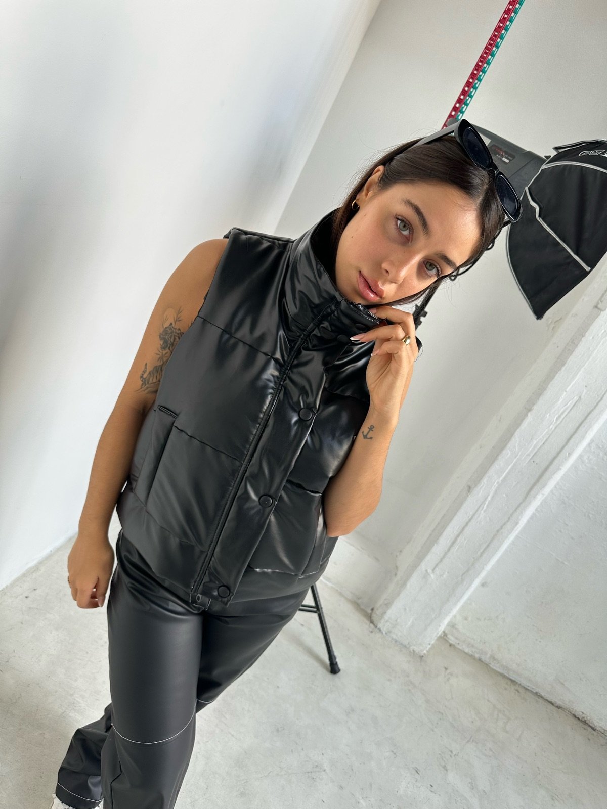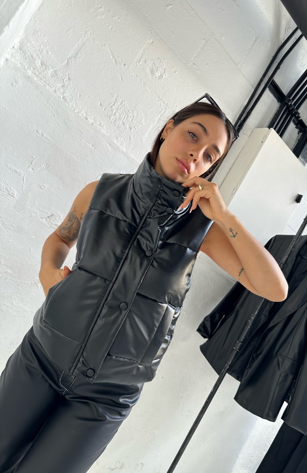 Chaleco de Eco Cuero Engomada con Guata y Tafeta, en su interior está completamente forrado con tafeta, proporcionando mayor confort y una sensación agradable al contacto con la piel. El abrigo está reforzado con guata, lo que garantiza calidez sin agregar volumen excesivo, ideal para los días fríos. Su diseño incluye una tapa que le aporta un toque distintivo, además de cierre frontal y broches metálicos para un ajuste seguro y versátil.