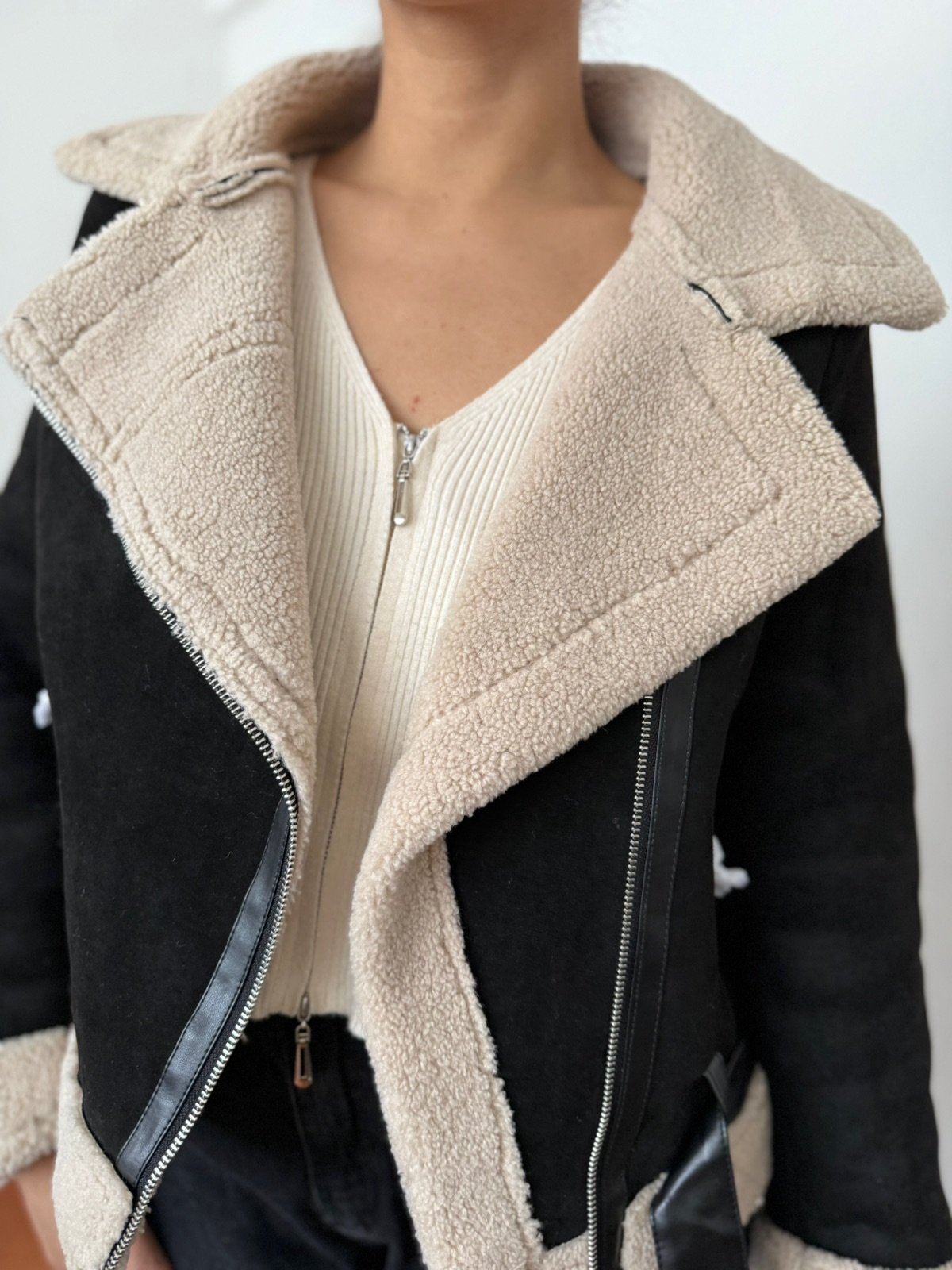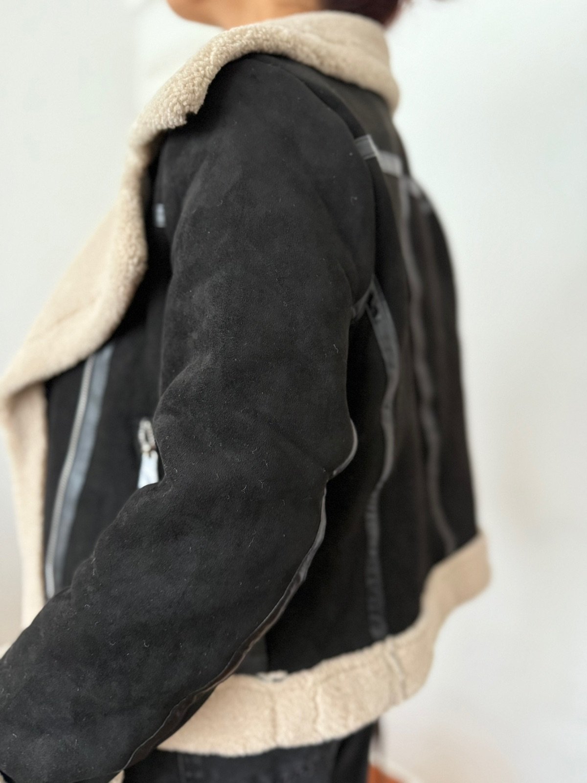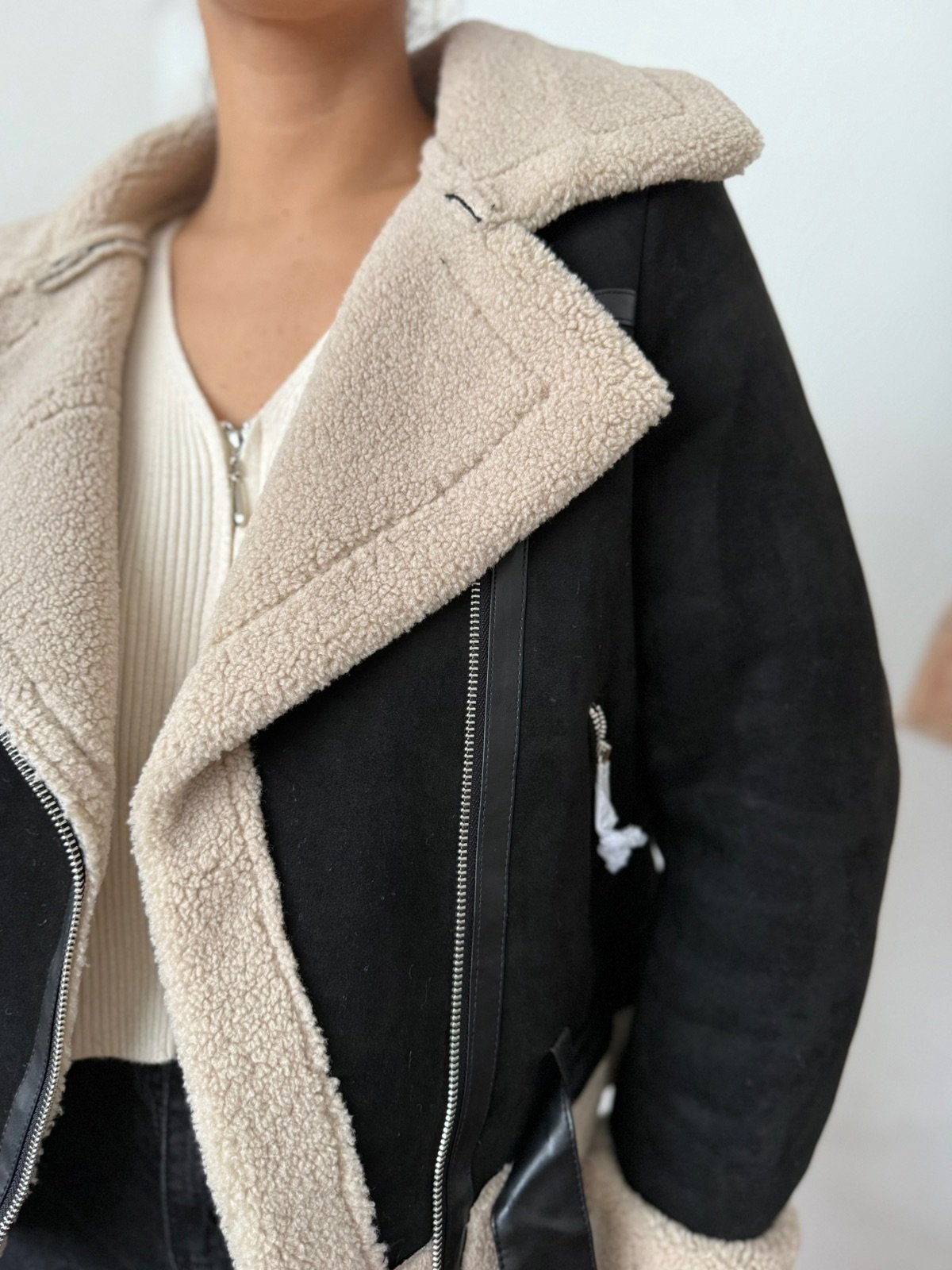 Gampera tipo gamulán importada, con interior forrado en corderito suave y abrigado. Exterior gamuzado al tacto, con detalles en los bolsillos y cinturón adicional para mejor ajuste. Ideal para el invierno.