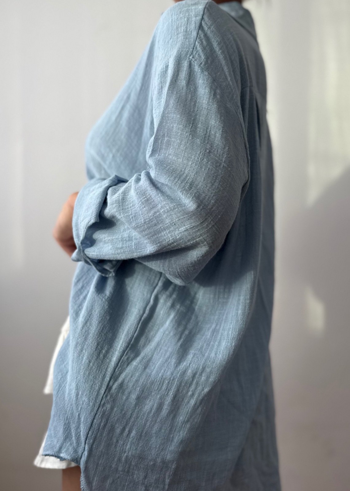 Camisa oversize de manga larga, confeccionada en una combinación de lino y bambula liviana de textura suave. Su diseño amplio con cuello clásico y botones en contraste la convierte en una prenda versátil, fresca y cómoda.